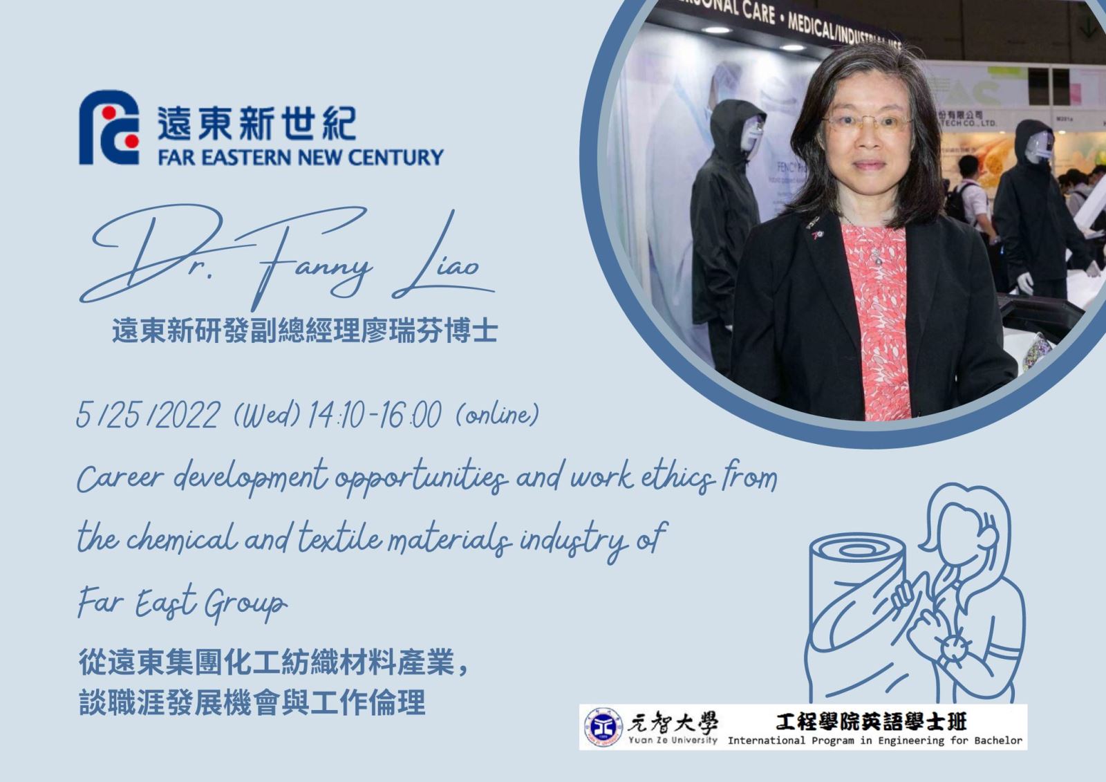 演講公告:從遠東集團化工紡織材料產業,談職涯發展機會與工作倫理 05.25(三) 14:10~16:00 Teams Online Talk